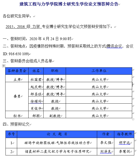 经过学院和工程力学系的精心准备,4月24日上午9点视频答辩会准时开始。正式答辩过程中,答辩人阐述论文、评委质询、答辩人回答问题、委员投票和评议,流程与线下答辩完全一致,各个环节紧张有序。经过近三个小时的视频答辩和会议讨论,李文强和刘泽良两位研究生顺利通过了博士学位论文预答辩。最后,答辩委员会主席杜国君教授宣读预答辩决议,本次预答辩在掌声中圆满结束。