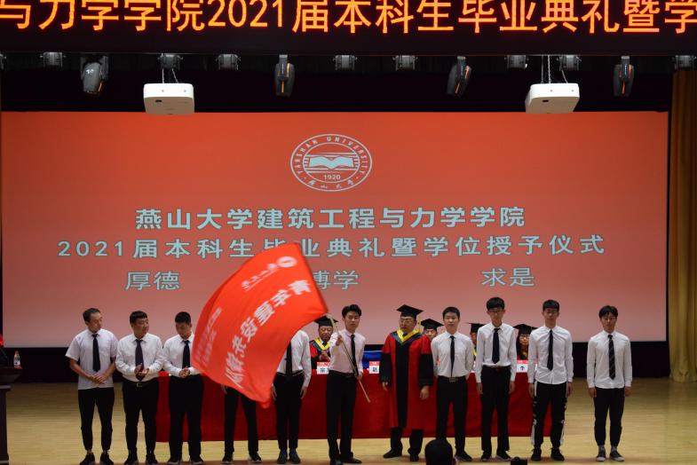建工学院今年共343名毕业生,其中有104人将奔赴施工一线。为了让建工学子更好的发挥专业优势,在条件艰苦的施工现场勇挑重担,争当先锋,学院特别成立了“2021届毕业生青年建设先锋队”。典礼上,赵庆新院长为先锋队授旗,鼓励建工学子投身基础设施重大工程,为推动国家城镇化进程添砖加瓦,贡献青春智慧和力量。