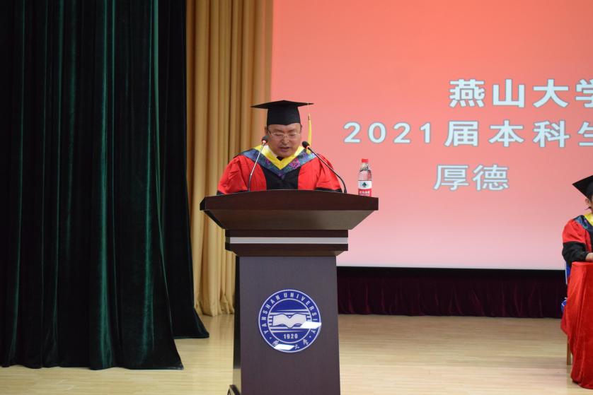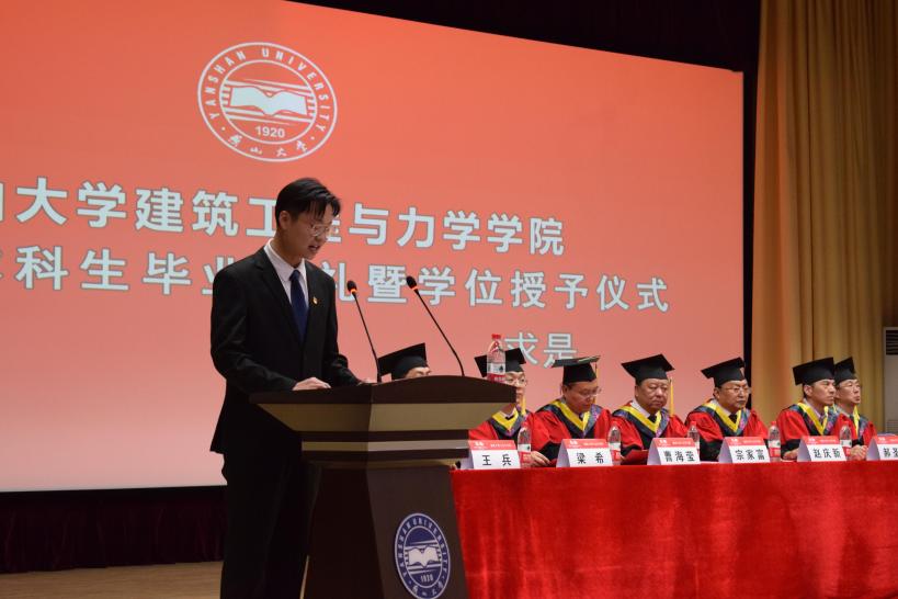 学院永远是毕业生坚强的后盾。院长赵庆新代表学院向各位毕业生表示热烈的祝贺,向为学生的成长倾注心血、默默耕耘的老师们致以最诚挚的感谢。赵庆新院长对毕业生提出六点希望:一是树立明确的奋斗目标。要带走燕大人为理想而奋斗的精神。二是脚踏实地干实事。把眼前每一份小的工作当成一份事业来完成。三是勇于创新。通过学习、思索和领悟提高学习效率。四是锻炼身体强健体魄。多为自己的身体充电。五是助人为乐。急人之困,助人终助己。六是多一点情怀。踏踏实实做好每一个工程就是建工人的大情怀。赵庆新院长表示,建工学院永远是每一位毕业生心灵的港湾,衷心祝愿大家平安健康、前程似锦。