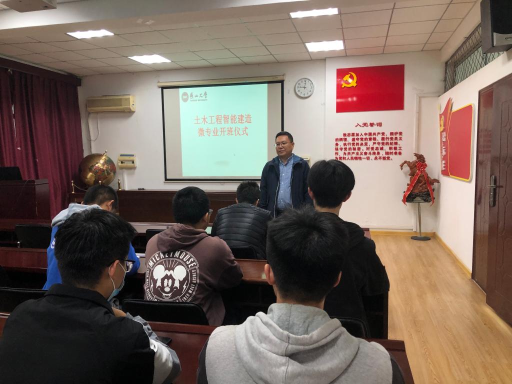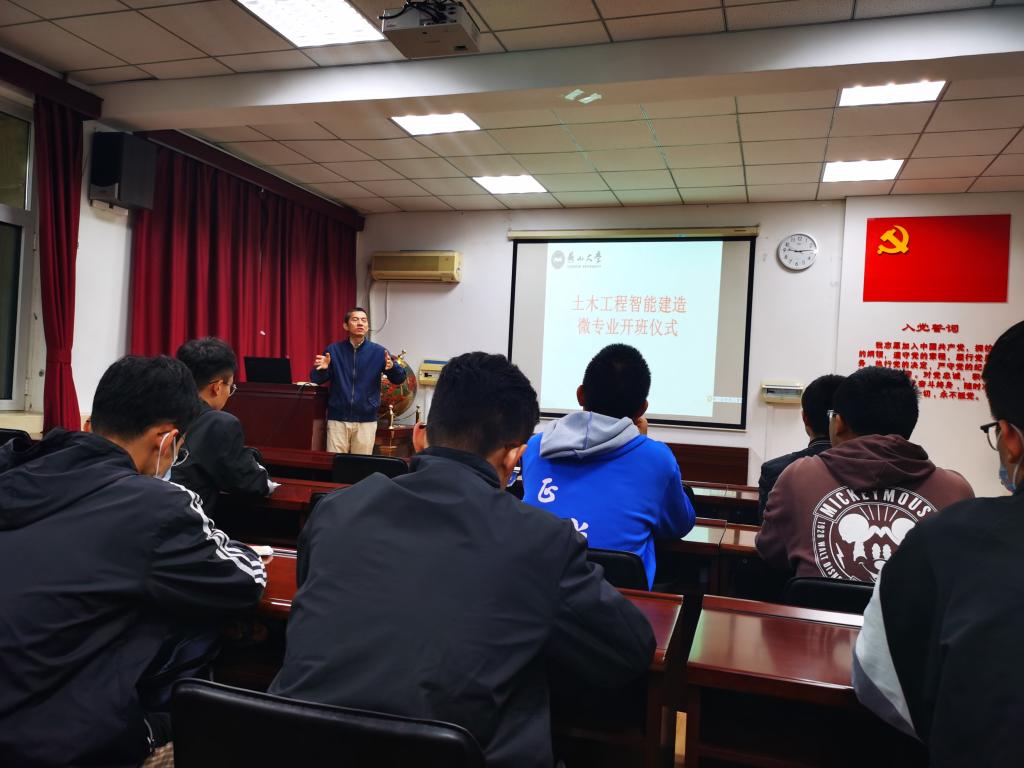 土木工程智能建造微专业开班仪式在建筑馆211会议室举行,首届微专业共招生学生20名,分别来自建筑工程、道路与桥梁工程、岩土与地下工程、工程力学、建筑环境与能源应用工程、机械制造及其自动化、冶金机械、机电控制工程等8个专业方向,基本形成了学科交叉融合的专业特点。微专业培养计划共设置16学分、8门核心课程,涉及机器人技术、BIM建模技术、3D打印技术、创新方法驱动、工程伦理等多个领域,将于2021年10月底正式授课。