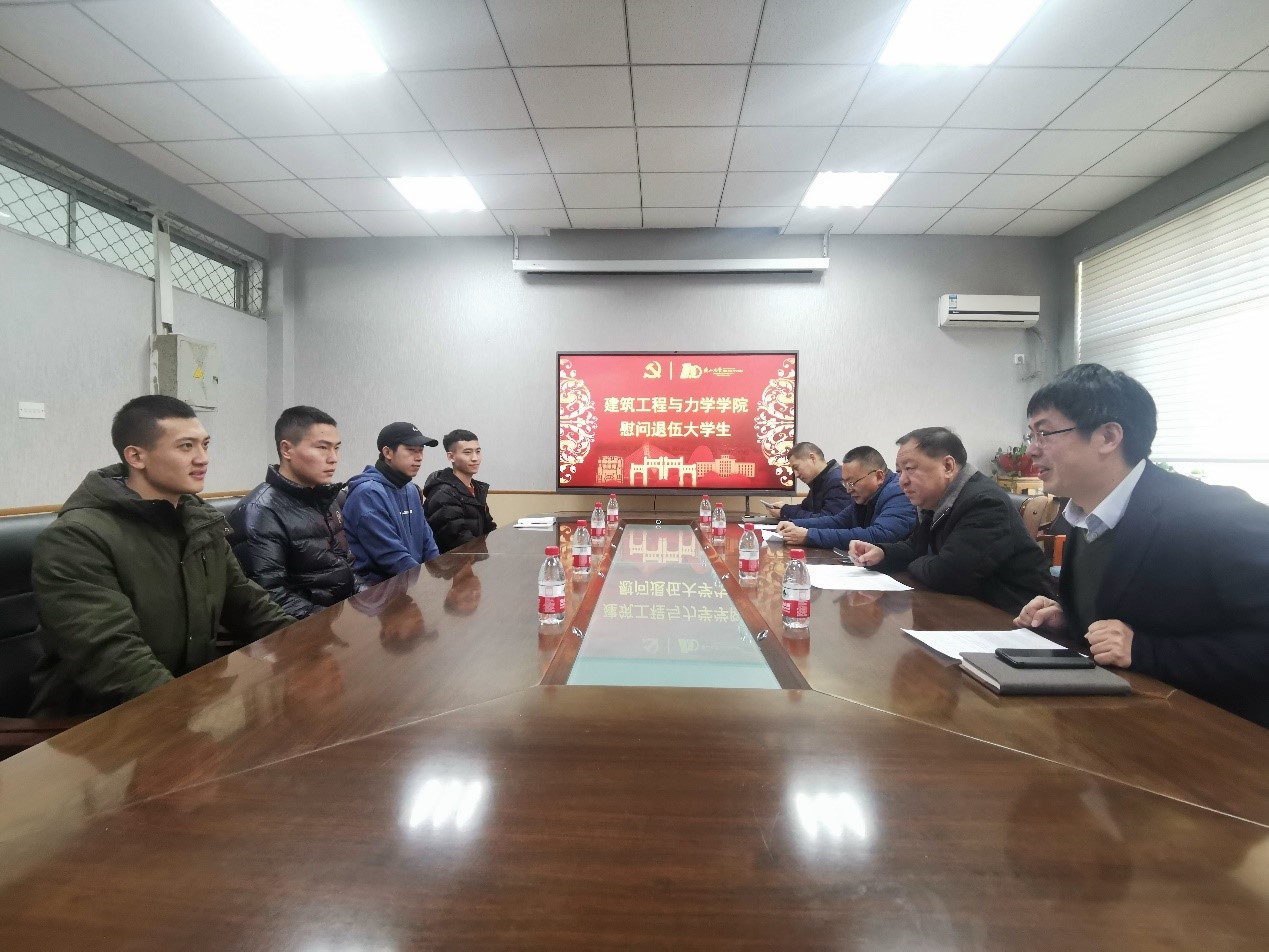 党委书记宗家富、院长赵庆新、副院长郝圣旺、党委副书记王兵在建筑馆203慰问学院退伍大学生。