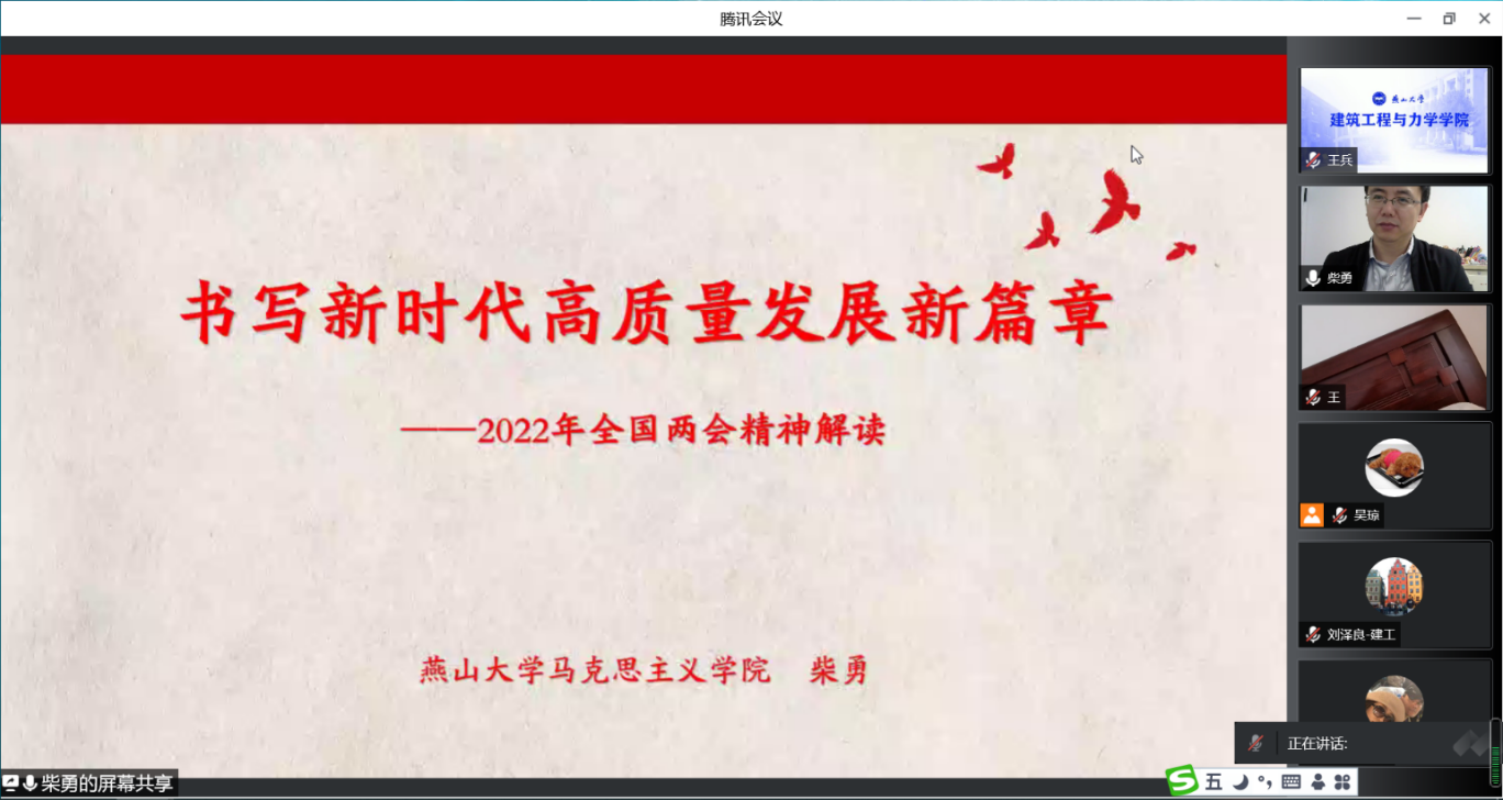 党委讲师团成员、马克思主义学院副院长柴勇教授作题为《书写新时代高质量发展新篇章——2022年全国两会精神解读》的辅导报告。全院教职工和研究生党员聆听了讲座,会议由学院党委副书记王兵主持。