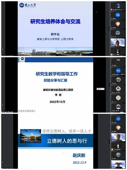 随后,三位来自不同学科的优秀研究生指导教师胡宇达教授、李岩教授和赵庆新院长,结合各自多年的研究生课程教学和研究生培养经验,分别做了《研究生培养体会与交流》、《研究生教学和指导工作经验分享与汇报》和《立德树人的思与行》三个主题报告,阐释了研究生教学和指导都要牢记教育的本心,德高为师,身正为范,导师要不断精进自己,继而影响和成就学生。