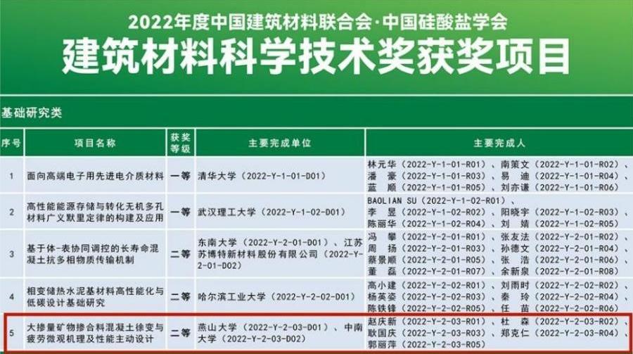 赵庆新教授作为“大掺量矿物掺合料混凝土徐变与疲劳微观机理及性能主动设计”项目成果第一完成人荣获基础研究类二等奖。