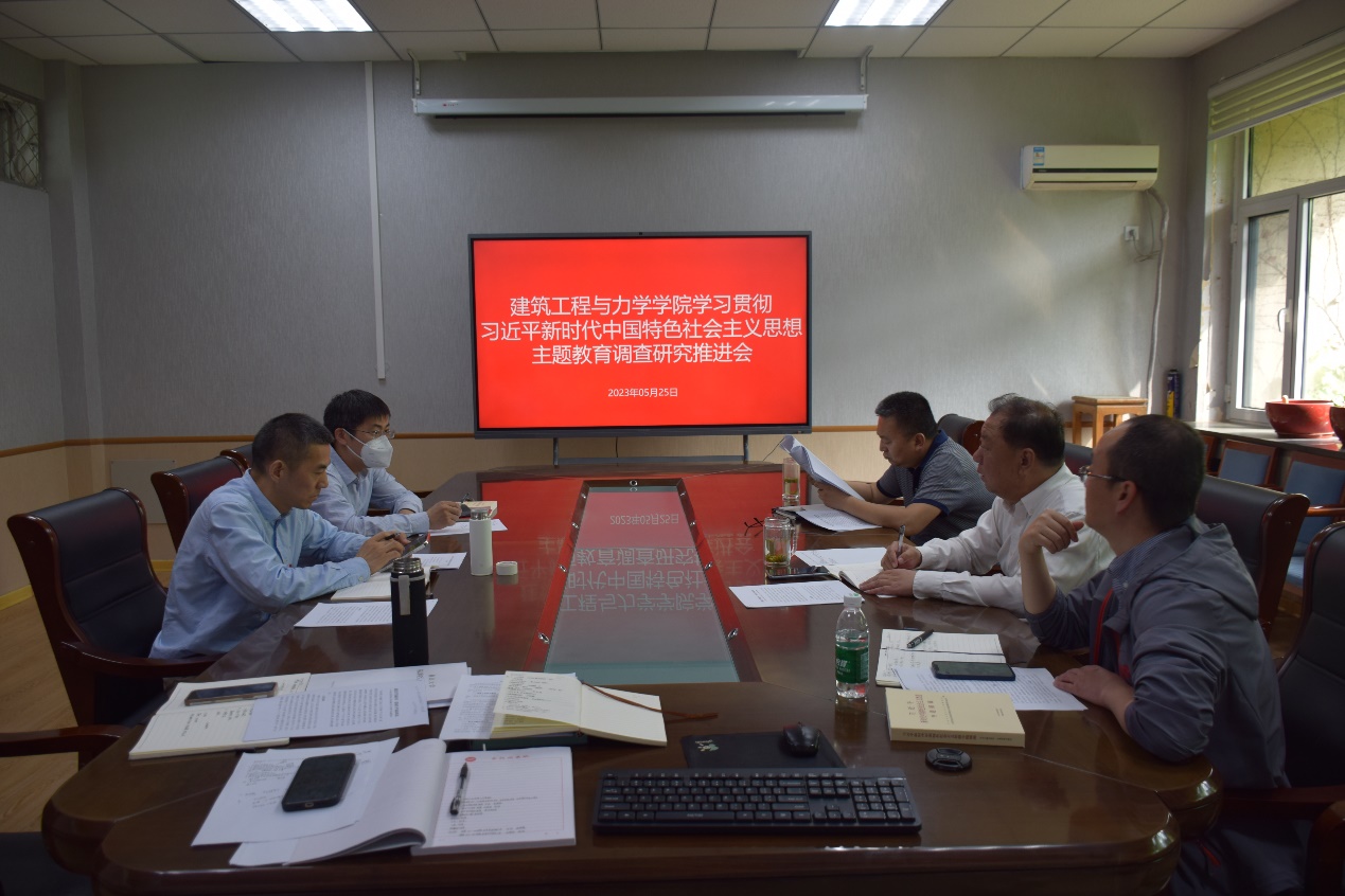 在建筑馆203室开展学习贯彻习近平新时代中国特色社会主义思想主题教育调查研究推进会。学院领导班子成员参加会议,会议由学院党委书记宗家富主持。