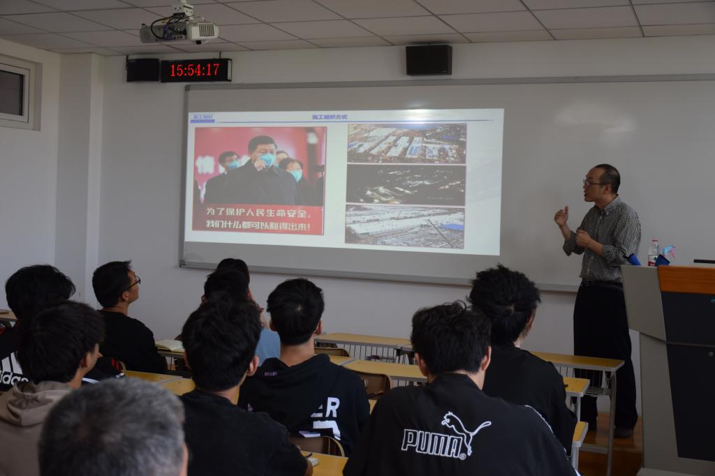 潘鹏程老师从河北省课程思政示范课程“土木工程施工组织”的教学内容中选取了一个教学节段进行现场授课。潘老师以疫情期间“火神山”医院建造中的施工组织为例,运用PPT并辅以相关视频,深入浅出地讲解了工程建造中的施工组织问题,并结合实例完美展现了我们党和国家始终坚持“生命至上、人民至上”的抗疫图谱。潘老师驾轻就熟,娓娓道来,将专业知识与思政元素有机融合,充分实现了知识传授与价值引领的统一,深深吸引了在场的每一位师生。潘鹏程老师授课完毕后,杨新宾老师就潘老师授课案例中蕴含的思政知识点进行了拓展和延伸,使同学们对抗疫精神的认识得到了进一步升华。