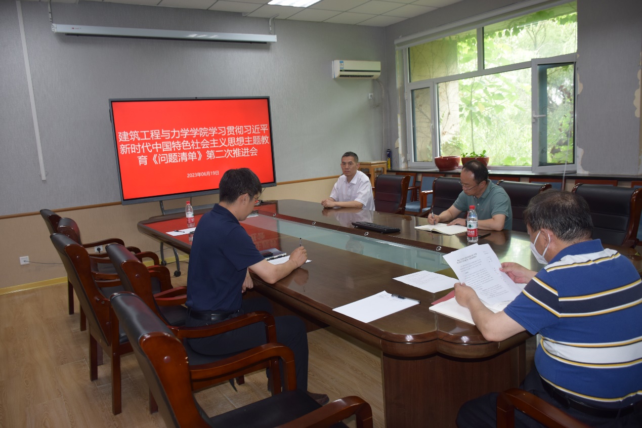 2023年6月19日上午,探花视频 在建筑馆203室召开第二次学习贯彻习近平新时代中国特色社会主义思想主题教育《问题清单》推进会。学院领导班子成员参加会议,会议由学院党委书记宗家富主持。