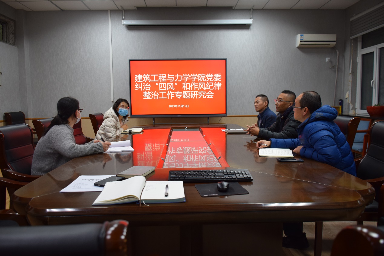在建筑馆203室召开纠治“四风”和作风纪律整治自查工作专题研究会。学院领导班子成员及副处级辅导员参加会议,会议由学院党委书记王继东主持。