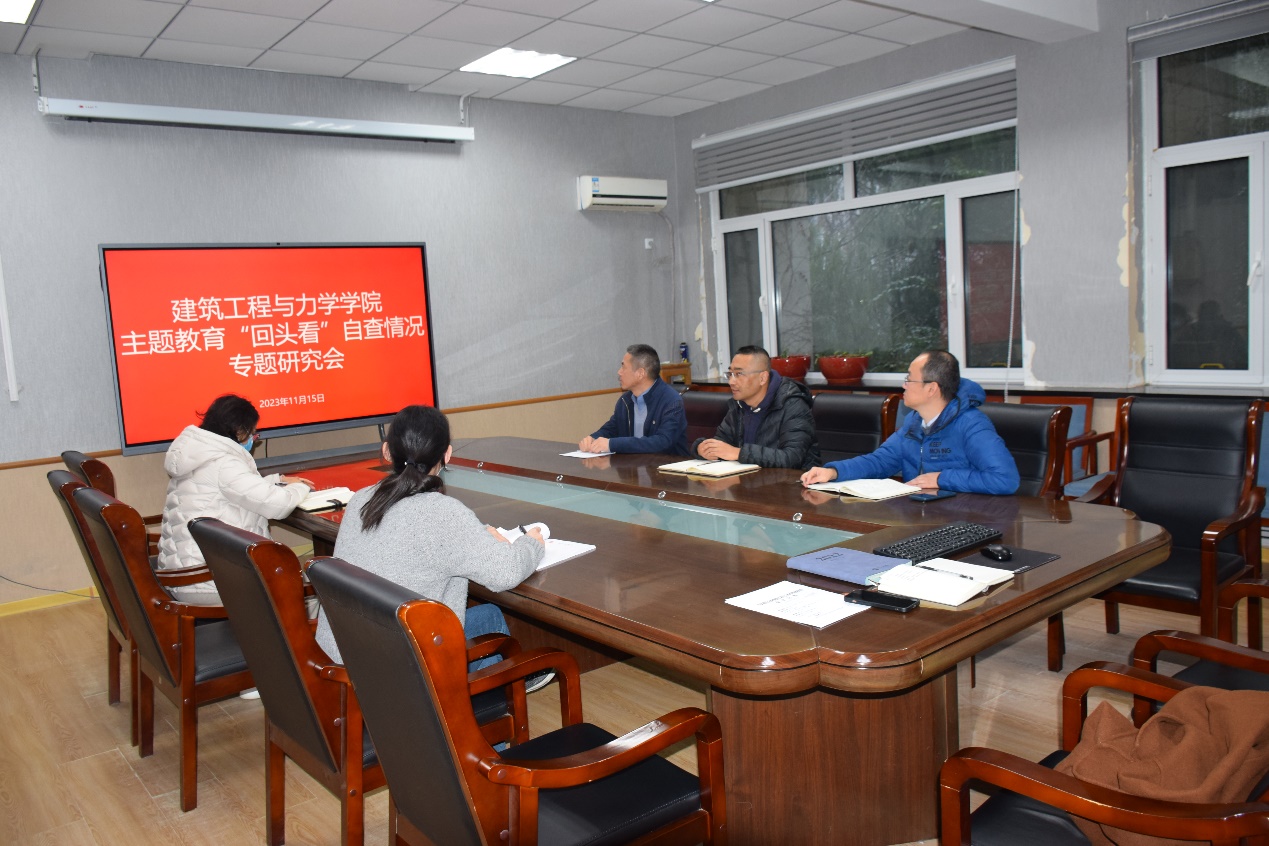 在建筑馆203室召开主题教育“回头看”自查情况专题研究会。学院领导班子成员、副处级辅导员及综合办室正科级秘书参加会议,会议由学院党委书记王继东主持。