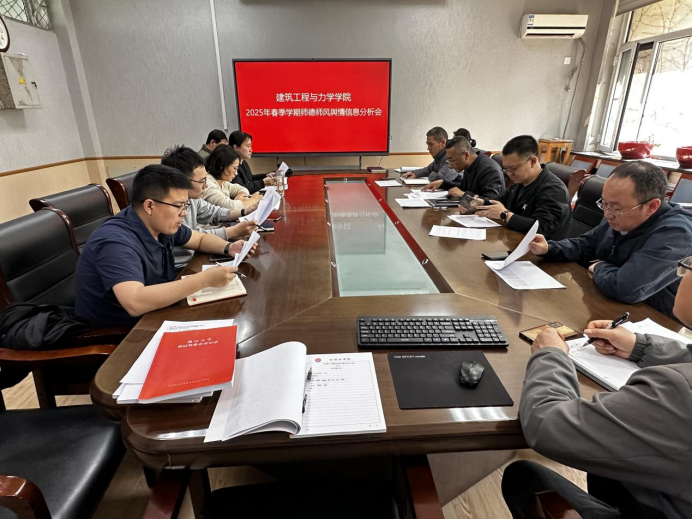 在建筑馆203会议室召开2025年春季学期师德师风舆情信息分析会,学院党委委员、党支部书记及科级干部参加。会议由学院党委书记王继东主持。