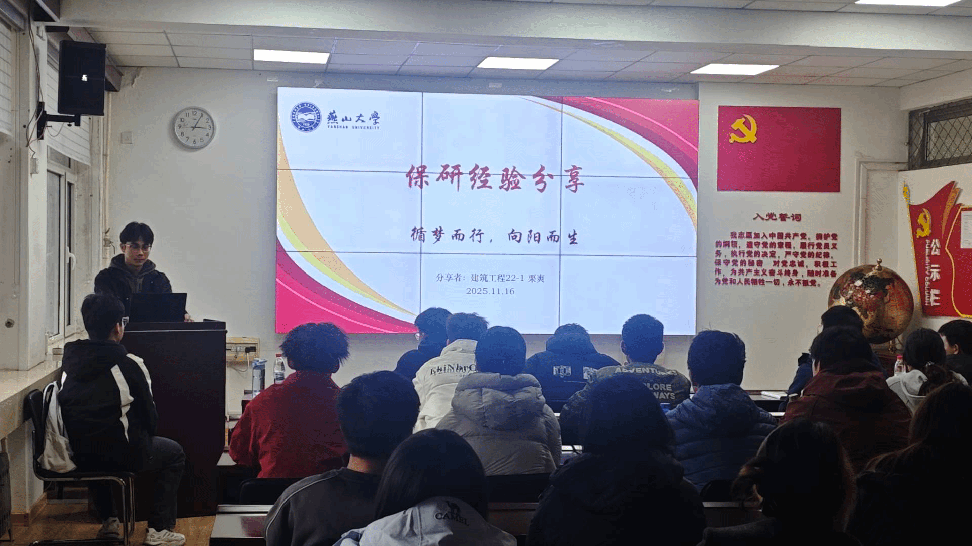 于2025年11月16日下午在建筑馆211教室举办“朋辈引领促成长,青春规划启新程”研究生推免与支教经验交流会。本次活动聚焦研究生推免路径规划与研究生支教团经历分享,吸引了学院大二、大三50余名同学积极参与,现场气氛热烈。