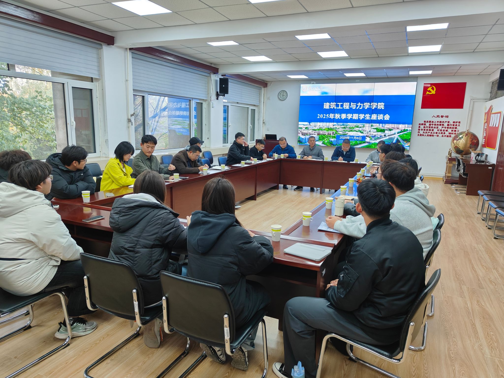 2025年秋季学期学生座谈会在建筑馆211会议室召开。会议由学院教学副院长曹海莹主持,院长郝圣旺、各系部负责人梁希、刘芳、陈正心、梁林、刘小蛮、各年级辅导员、综合办公室焦莉丽、刘晓倩以及各年级学生代表参加了此次座谈会。
