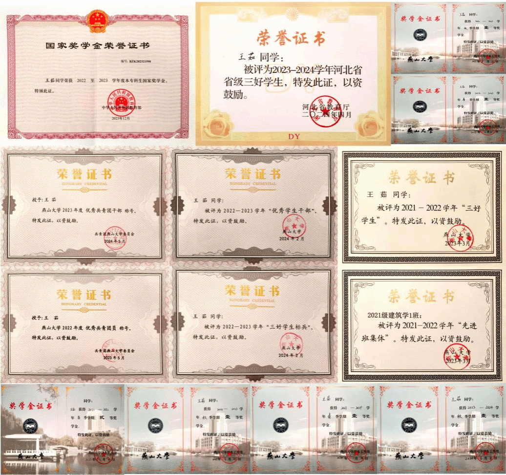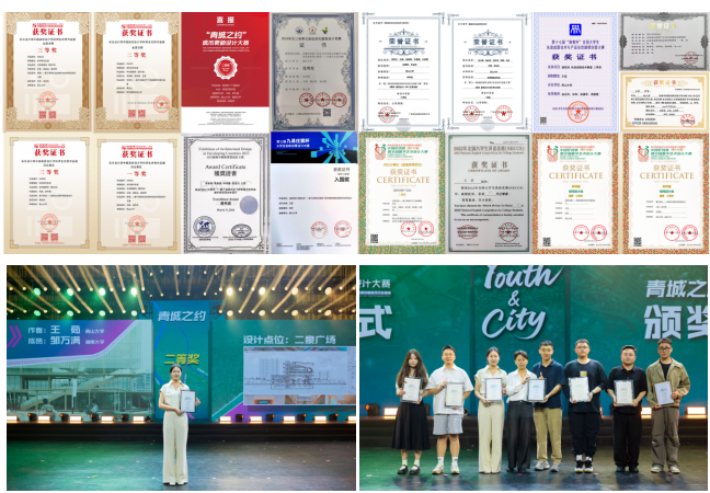 在学科竞赛的舞台上,王茹同样展现出扎实的专业功底与突出的综合素养。她注重以赛促学、以赛精技,在持续备赛中锤炼设计思维、技术整合与团队协作能力。她曾获得全国大学生先进成图技术与产品信息建模创新大赛二等奖、全国高校BIM毕业设计创新大赛一等奖等14项国家级奖项。这些荣誉背后,是她对建筑表达、技术应用与设计深化不懈的追求,也是一次次从理论走向实践、从课堂迈向赛场的跨越与成长。